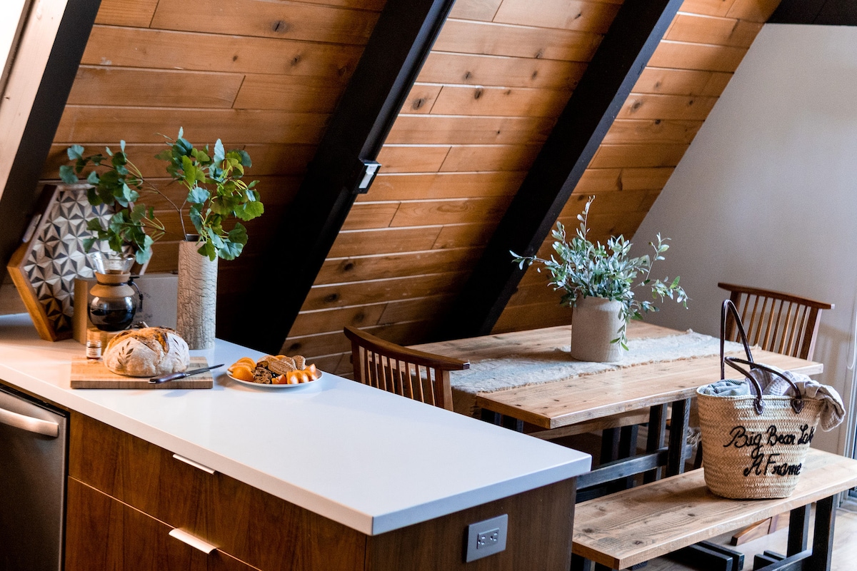 After a trip to the local Farmers Market, come home and whip up delicious home-cooked meals easily and conveniently, with our newly renovated, open kitchen. This modern cabin kitchen boasts pristine white quartz countertops and gorgeous walnut cabinets. It’s equipped with everything you need to feel at home – brand new stainless steel kitchen appliances, including a refrigerator, gas range, microwave, and dishwasher, kid-friendly dishes and cutlery, pour-over drip coffee kettle, automatic coffee machine, and even a rice cooker.
